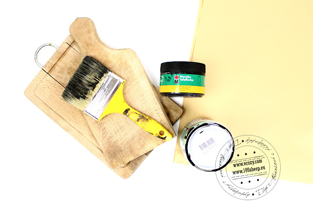 На снимката се виждат необходимите материали: Директно боядисвате върху дърво с боята за черна дъска или първо с блажната, изчаквате да изсъхне напълно и накрая с боята за черна дъска.